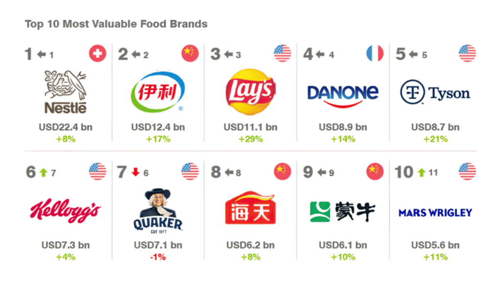 Following Nestle, Yili secured the second position in Brand Finance’s ranking of the most valuable food brands. The Chinese dairy manufacturer has consistently maintained this spot since surpassing Danone in 2020.
