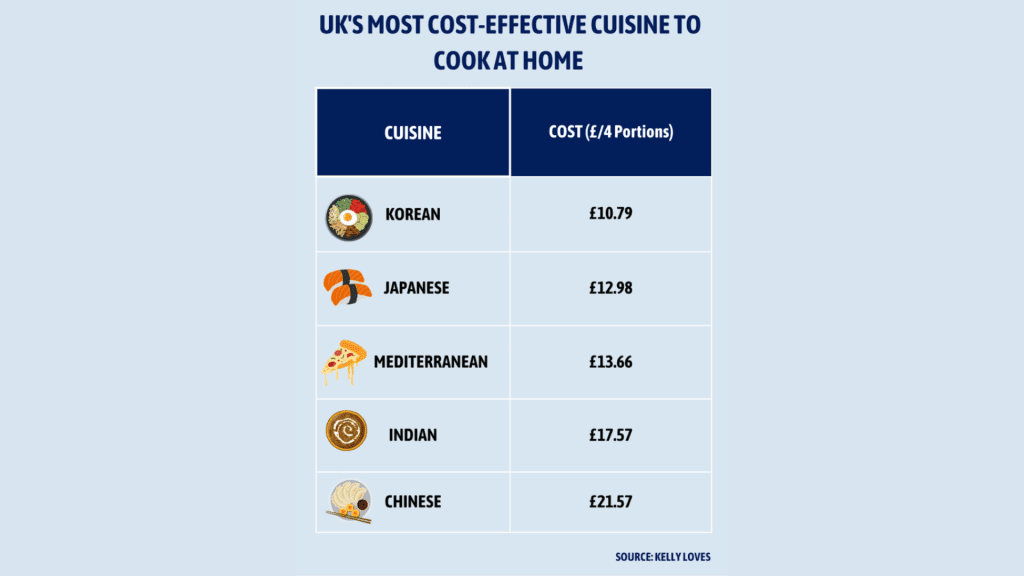 The results indicated that, when preparing meals at home, Japanese cuisine is the second most economical choice, coming in at around £10.79 for a family of four. Following closely is Mediterranean cuisine at £13.66, with Indian dishes at £17.57 and Chinese cuisine at the highest cost of £21.57.